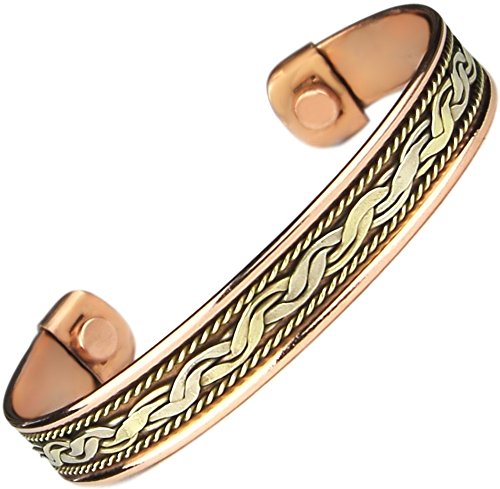 Made of Pure Copper. This Bracelet Fits the Most.. There is a tiny magnet at each edge of the bracelet. Many people believe that these bracelets give relief to Arthritic & Rheumatic Conditions. Bracelet has Brass and other metal accents to have the right shape and style. As this is made of Copper, Bracelet will tarnish after using it for sometime. Also, it can discolor on the arm for some people.. Discoloration on the arm can be avoided by applying clear fingernail polish to the area that touches the skin. (But. this discoloration is where people believe the healing properties are most effective) These Copper Bracelets are not being sold as medical devices or to replace any professionally prescribed medical treatment. Magnetic therapy should not be used if you are pregnant, or wear an electronic medical device of any kind. Please consult your doctor before use. We do not make any implied or overt claims for treatment, cure, or mitigation of any illness.