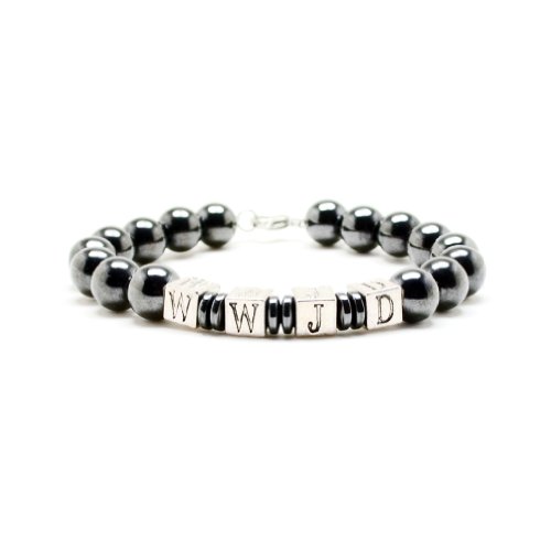 This is for a magnetic hematite bracelet with WWJD accents beads. A Great way to show your passion and faith. This shiny metallic looking beaded bracelet is eye-catching wherever it appears.Each gunmetal black magnetic hematite bead (10 mm )is a power mag