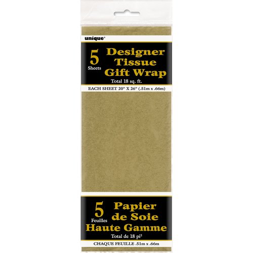 Wrap your gifts in color with these Metallic Gold Tissue Sheets. Metallic Gold Tissue sheets are a cheerful way to wrap your presents beautifully. Each pack comes with 5 20" x 20" Metallic Gold Tissue Sheets. Metallic Gold Tissue Sheets are also great for decorating or for crafts. Coordinate with other gift wrap supplies from Unique.