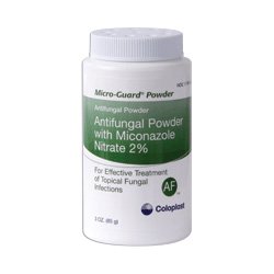 MICROGUARD POWDER, 3 OZ2% miconazole nitrate in a noncaking corn starch base for the treatment of superficial skin infections caused by yeast (candidiasis), jock itch (tinea cruris), ringworm (tinea corporis) and athleteÆs foot (tinea pedis)Pours easily3-oz. bottleeaSOLD BY EACHManufacturer: Coloplast (62) - One of the world leaders in manufacturing and distribution of healthcare equipment and supplies. Most of their products offer a limited lifetime warranty (excluding disposable products). Estimated ground shipping time on this product is 2-5 business days.