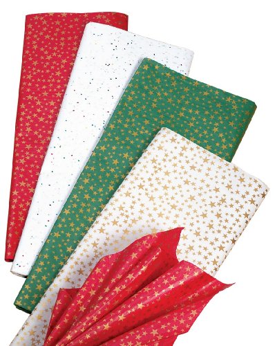 This gleaming assortment of gold stars Christmas tissue paper makes the holidays bright - whether lining gift boxes, decorating bags, or simply wrapping a beautiful package. 24-piece holiday tissue paper set includes four sheets each: gold stars on white, gold stars on red, gold stars on green, plus 12 sheets of confetti-textured sequins on white. Colored tissue paper measures 20" x 26" each.