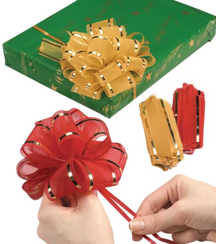Foolproof and fancy, these beautiful sheer organza pull bows take shape when you pull both ends of what looks like an ordinary organza ribbon. Perfect every time, this sheer organza ribbon is trimmed in gold for an elegant touch. Set of four organza ribbon bows includes two red and two gold. Organza bows are 5" diameter when opened.