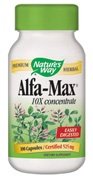 Alfalfa (Medicago Sativa) is a nutritive herb rich in minerals and vitamins especially Iron and vit K considered an estrogen precursor, also may be used for allergies, anemia, arthritis, asthma, blood disorders, fatigue, digestion, high cholesterol and diabetes etc.Nature's Way Alfa-Max is a highly concentrated (10X) extract of fresh green Alfalfa along with Alfalfa leaves (Medicago sativa) in preservative-free capsules. It is made more assimilable by removing the indigestible cellulose fiber.