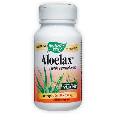 Aloelax by Nature's Way 100 Capsule Proprietary blend of Aloe vera (latex) Fennel (seed). Dosage Take at bedtime as needed with a full glass of water. Adults children age 15 and over Take 1 capsule daily. Do not take more than 1 capsule in a 24-hour period. Children under 15 years of age Consult a doctor. Do not take for more than 1 week as frequent or prolonged use may result in dependence. Dosage Form Precautions Do not use when nausea or vomiting are present unless directed by a doctor. Consult a doctor if you notice a sudden change in bowel habits that persist over 2 weeks. Rectal bleeding or failure to move bowels after use may indicate a serious condition. Discontinue use and consult a doctor. Read and follow directions carefully. Do not use if you have or develop diarrhea loose stools or abdominal pain because aloe vera may worsen these conditions and be harmful to your health. Consult your physician if you have frequent diarrhea or if you are pregnant nursing taking medication