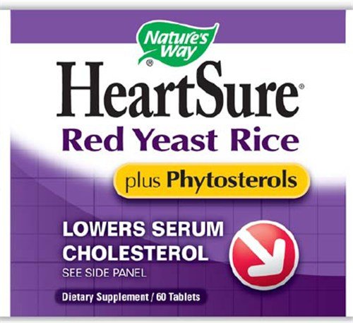 HeartSure Red Yeast Rice Plus Phytosterols by Nature's Way 60 Tablet HeartSure Red Yeast Rice plus Phytosterols Nature s Way HeartSure contains Phytosterols which may reduce the risk of heart disease by helping to block the absorption of dietary cholesterol. Daily intake of at least 800 mg. of plant sterols as part of a diet low in saturated fat and cholesterol may reduce the risk of heart disease. Each tablet of Heart Sure supplies 400 mg of plant sterols. Item Size 60 Tablets Supplement Facts Supplement Facts Serving Size 1 Tablet Servings Per Container 60 Amount Per Serving DV Total Carbohydrate 1 g 1 Red Yeast Rice ( Monascus Purpureus ) 600 mg Phytosterols (from non-GMO pine tree extract) 400 mg Percent Daily Values are based on a 2 000 calorie diet. Daily Value (DV) not established Dosage Take 1 tablet daily. For intensive use take 1 table up to 4 times daily. Contains Other Ingredients Cellulose Modified cellulose Modified cellulose gum Vegetable stearic acid Silica Vegetable m