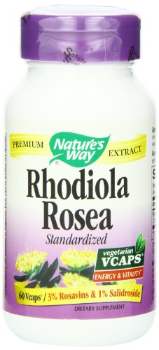 Rhodiola Rosea by Nature's Way 60 VegCap Rhodiola Rosea 60 VegCap Product Nature's Way Rhodiola Rosea extract is standardized to 3 rosavins and 1 salidroside which has been shown to produce the most beneficial results in clinical studies. Rhodiola an adaptogen comes from Arctic regions and has been shown to increase energy physical endurance and well-being. Suggested Use As a dietary supplement Take 1 capsule two times daily preferably before meals. For best results take in the morning and at mid-day. - Or as directed by your healthcare professional. Supplement Facts Serving Size 1 VCap Servings Per Container 60 Amount Per Serving Daily Value Rhodiola Rosea extract (root) 3 rosavins and 1 salidroside 250mg Daily Value Not Established Percent Daily Values are based on a 2 000 calorie diet Other Ingredients Plant-derived capsule Cellulose Silica Magnesium stearate Warnings Keep out of reach of children. As with all dietary supplements consult your healthcare professional before use. See
