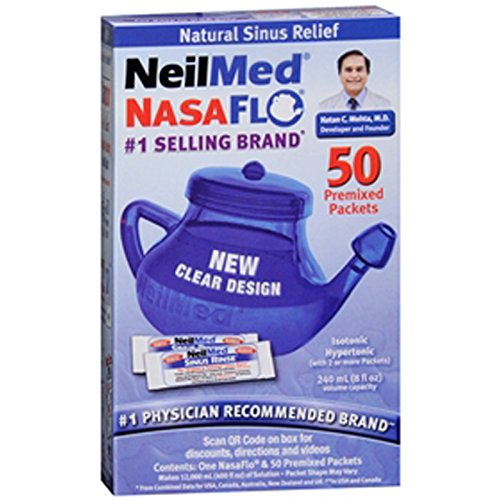 Contents: 1 NASAFLO Neti Pot Irrigation Device - 8 oz. (240 ml); 50 packets of USP Grade (99.9% Pure) Sodium Chloride & Sodium Bicarbonate Mixture (pH balanced, natural ingredients, isotonic, preservative free & iodine free); educational brochure; directions.