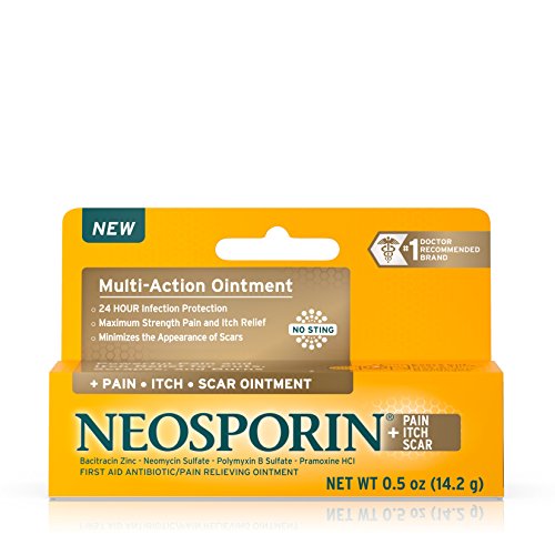Neosporin + Pain, Itch, Scar Ointment provides 24-hour infection protection* and maximum strength itch and pain relief for minor cuts, scrapes, and burns. The no sting formula with unique Heliderm Technology provides a nourishing environment for the skin. This antibiotic ointment addresses all aspects of healing by protecting against infection, providing pain and itch relief, and minimizing the appearance of scars. *In lab studies.