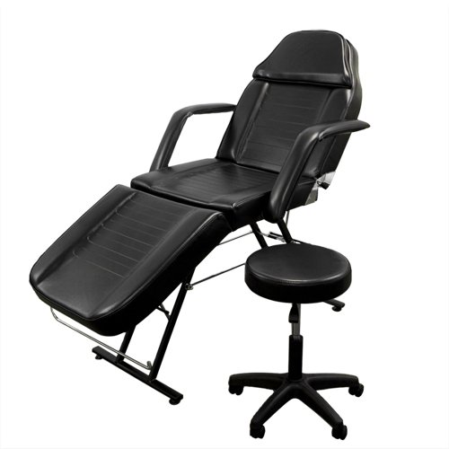 FEATURES: 3 Section facial bed massage table; Black finish; Folding design provides easy transportation; Durable PU leather (waterproof & oil resistant); Solid heavy-duty welded steel sturdy frame stand; Removable cushion armrests; Removable head cushion with 6" face hole for massage table conversion; Adjustable thick back rest and footrest; Adjustable backrest tilts up 45 degrees; Adjustable footrest tilts down 45 degrees; Automatic lock provides the table with strength and stability; Non-slip feet (prevents the table from shifting and floors from gouging); Round corner design for safety; 4-1/2" thick high density foam (thickest on the market); Dimensions: 24" (W) X 71" (L); Dimensions: 25.5" + 4.5" Foam = 30" Height; Dimensions: 6" Face hole; Weight Capacity: 500lbs; Suggested retail is $499.99; FREE matching hydraulic stool; Seat diameter: 14-1/4"; Height adjustment: 18" to 25" high; 3" Thick high density foam; 5 Star base for extra stability