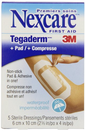 2-3/8 x 4 inch. Breathable, keeps out dirt and germs. Waterproof in bath or shower. Non-stick pad with clear adhesive cover. Hospital proven. Nexcare Absolute Waterproof Premium Adhesive Pad is a waterproof dressing which consists of non-stick, absorbent pad bonded to a large thin film backing coated with a hypoallergenic, water resistant adhesive. Use Nexcare Absolute Waterproof Premium Adhesive Pad to protect wounds such as cuts, burns, abrasions and post-surgical incisions. Hospital Name: 3M Tegaderm Dressing + Pad. Hypoallergenic. Sterility guaranteed unless individual wrapper is opened or damaged. Made in USA.