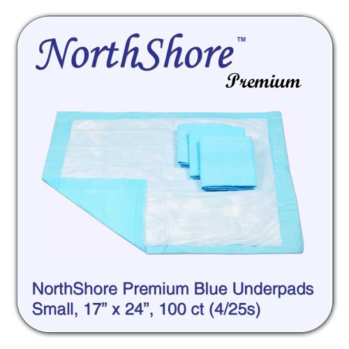 NorthShore Premium Blue Underpads (Chux) are the most absorbent standard blue chux available. They are latex-free with a diamond embossed quilt pattern. Protects bedding, furniture, or wheelchairs from leakage. Designed with a highly absorbent embossed core and soft, quick-drying coverstock. (4 bags of 25)