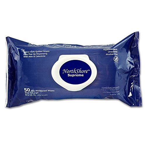 Our NorthShore Supreme Wipes are extra large and for use on the entire body. The wipes are gentle and premoistened with Aloe and Calendula to soothe the skin. Quilting makes these wipes extra soft and absorbent. They can be used for cleansing of the entire body. Latex-free. Easy pop-up dispensing. Wipes are 9 x 13 inches. Do not flush, dispose in trash.