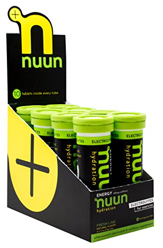 Each tube of Nuun Energy contains 10 effervescent tablets. Simply drop a tablet into 16oz of water to make Nuun! Each tablet delivers 360 mg Sodium / 100 mg Potassium / 25 mg Magnesium / 13 mg Calcium as well as 100% of vitamins B6, B12, Niacin, and 40 mg of caffeine (from organic green tea extract). The electrolytes in Nuun help maintain fluid balance, prevent cramping, and aid in efficient muscle performance, while B-vitamins and a modest amount of caffeine help the body access and utilize stored energy.