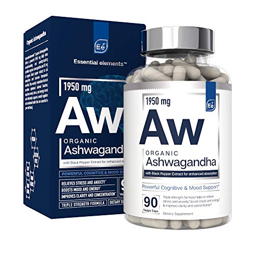 Essential Elements Organic Ashwagandha offers a powerful 1950 mg daily dose mood-boosting organic ashwagandha and 15 mg of organic black pepper extract to aid absorption and increase therapeutic benefits. This mentally restorative formula provides optimized adrenal function, equalizes mood, stress, and energy levels and effectively supports overall cognitive and emotional health that are essential to your well being.