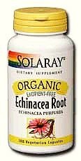 Organic Echinacea Purpurea Root 450mg by Solaray 100 Capsule SOLARAY Organic Echinacea Root is organically grown in accordance with the California Organic Foods Act of 1990 and certified by the Washington State Department of Agriculture. Size 100ct 450mg Directions As a dietary supplement take two capsules two or three times a day with meals or a glass of water. For optimal results take continually for 14 days. Serving Size 2 Capsule 50 Servings per container Ingredients Amount per serving Daily Value + Organic Echinacea (Echinacea purpurea) (root) 900 mg Total Carbohydrate 1 g 1 Key to Ingredients Daily Value not established. + Percent Daily Value is based on a 2 000 calorie diet. Values differ depending on age Values differ depending on age Other Ingredients Other See product label for more information.