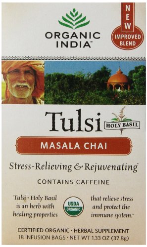 An exotic blend of Tulsi, black tea & classic chai spices. Stress Relieving Energizing Abundant in antioxidants Powerful adaptogen Contains Caffeine Tulsi, black tea, and chai spices make the perfect exotic chai that stimulates your senses and soothes your soul. Add milk or nondairy milk and a touch of sweetener for a delicious authentic India experience! Throughout India, Tulsi is considered "The Queen of Herbs" and is revered as a sacred plant infused with healing power. Traditionally grown in an earthen pot in every family home or garden, Tulsi (also known as Holy Basil) makes a delicious and refreshing tea that possesses wonderful health benefits that support the body's natural immune system while relieving the body's negative reaction to stress. Tulsi's remarkable life-enhancing qualities, noted repeatedly in ancient Indian scriptures dating back 5,000 years, are now here for you to fully enjoy. Namaste! Organic India is committed to responsible packaging. The tea package carton is made from 100% recycled paperboard, with a minimum of 30% post-consumer content. Please recycle again. Our tea bags are made from unbleached, biodegradable fiber. At the heart of ORGANIC INDIA is our commitment to be a living embodiment of consciousness in action. We work with thousands of family farmers in India who cultivate thousands of acres of organic farmland. ORGANIC INDIA actively promotes sustainable agriculture and pays a premium market rate to our farmers. All our products promote wellness and are certified organic. Each product you hold in your hands is one link in a chain of love, respect and connectedness between our farmers and you. By choosing ORGANIC INDIA you are completing this chain, which gives training and a living wage to the Indian farmers, creates a sustainable environment and brings happiness and well being to you.