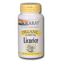 Organic Licorice Root 450mg by Solaray 100 Capsule SOLARAY Organic Licorice is organic and certified organically processed in accordance with Oregon Tilth standards and the California Organic Foods Act of 1990. Size 100ct 450mg Directions As a dietary supplement take two capsules two or three times a day with meals or a glass of water. Serving Size 2 Capsule 50 Servings per container Ingredients Amount per serving Daily Value + Organic Licorice (Glycyrrhiza glabra) (root) 900 mg Total Carbohydrate 1 g 1 Key to Ingredients Daily Value not established. + Percent Daily Value is based on a 2 000 calorie diet. Values differ depending on age Values differ depending on age Other Ingredients Vegetable Cellulose (capsule) Other See product label for more information.