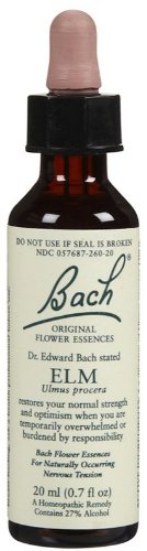 Bach ORIGINAL FLOWER ESSENCES Dr. Edward Bach stated ELM Ulmus procera Restores your normal strength and optimism when you are temporarily overwhelmed or burndened by responsibility Bach Flower Essences For Naturally Occurring Nervous Tension 20 ml (0.7 fl oz) A Homeopathic Remedy Contains 27% Alcohol INDICATIONS: For relief of naturally occuring nervous tension. WARNINGS: Keep out of reach of children. If pregnant or breast-feeding, ask a health professional before use.