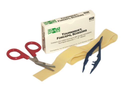 The Pac-Kit 17-014 tourniquet kit is used to reduce traumatic bleeding in a limb, and contains a rubber tourniquet, plastic forceps, and scissors. The tourniquet measures 3/4" x 18" relaxed.