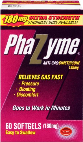 Phazyme Ultra Strength contains the highest dose of the number 1 physician and pharmacist recommended ingredient for the treatment of bloating, pressure and discomfort. Phazyme comes in easy to swallow 180mg softgels, and provides gas relief in just minutes.