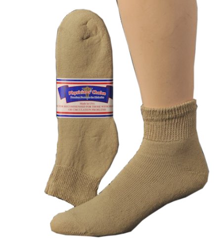 PHYSICIAN'S CHOICE DIABETIC TAN QUARTER SOCKS SIZE 10-13 80% COTTON. LOOSE, NON- BINDING TOP WITH 11 INCHES OF CROSS STRETCH TO ALLOW FOR BETTER CIRCULATION IN THE LEGS. 3PAIR TO BAND. MADE IN USA!