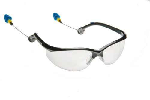 PlugsSafety PSGLS2A-PP safety glasses with PermaPlug ear plugs is a pair of safety glasses with polycarbonate lenses and retractable molded earplugs for simultaneous eye and ear protection. The polycarbonate lenses resist impact and help protect the eyes from UV rays, and the molded earplugs are attached by a cord that retracts into the arms of the glasses for storage. The clear lenses have a scratch- and fog-resistant coating for durability and to help prevent moisture from accumulating on the lenses. The glasses meet American National Standards Institute (ANSI) Z87.1-2010 for occupational and educational eye and face protection devices. The earplugs are molded and have a stiff core for greater comfort and ease of insertion and removal than foam earplugs that expand within the ear canal. They have a noise reduction rating of 25 dB and are replaceable.