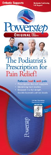 The Podiatrist's Prescription for Pain Relief! Your feet go through a major workout every day. Without proper foot posture and support, your foot tends to roll inward, causing strain or pain in your heel and arch, or even your ankles, knees or lower back. Dr. Les Appel, designer of PowerStep, has created and prescribed thousands of customized arch supports over the past 30 years, for everyone from athletes to salesmen to skycaps. But not everyone needs or wants to pay the cost of customized prescription products. That's why Dr. Appel invented Powerstep. Powerstep is a unique podiatric support system specifically intended to relieve heel and arch pain, and prevent foot strain and injury. Unlike leading insoles or arch supports, Powerstep's unique 4-phase design is optimized to provide complete foot support and comfort, and correct foot posture and mechanics. - Strong prescription-like arch support, calibrated with flexibility for comfort - Unique double-layer cushion casing to enhance comfort from heel to toe - Heel cradle and Platform to stabilize / protect the heel during landing - Heat and slip reducing anti-microbial ETC fabric for dryness - PowerStep is available in more sizes than any other retail brand: Mens 3-14.5 and Womens 5-15.5 WARNING: These devices are not intended for people with severe foot deformities or suffering from circulatory diseases which result in infections or ulcerations on the bottom of the feet. In such circumstances, consult your podiatrist or medical professional before using. As with any product, consult a medical professional if pain persists. GUARANTEE: 30 day money back guarantee for any reason. Lifetime guarantee against breakage of plastic arch support (inside casing) when used under normal condistions.