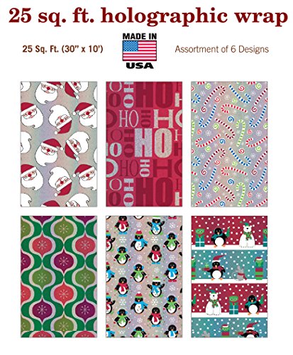 Premium Holographic Foil Christmas Gift Wrap Wrapping Paper for Men, Women, Boys, Girls, Kids 6 Different 10 ft X 30 in Rolls Included Xmas
