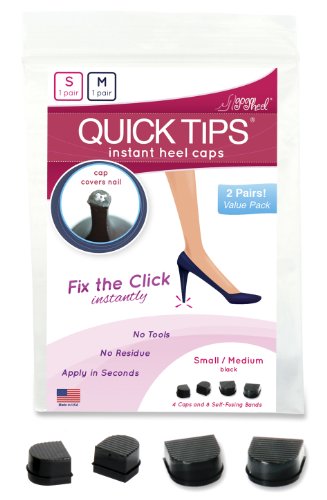 Other DIY replacement heel tips require pliers and a hammer, and there's no guarantee you'll be able to remove the old heel tip. QUICK TIPS® Heel Caps work in 1 minute (or less) and involves no tools. It eliminates the clicking sound, saves/protects your shoe heel, and extends the life of your high heels. Perfect to use in-between shoe repair visits, when you don't live near a shoe repair shop, or need an emergency solution that is both durable and convenient. Watch 1-Minute Video Demo: GoGoHeel.com/video-demo