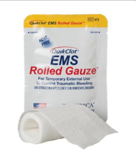 This hemostatic gauze product is a soft white sterile gauze roll impregnated with QuikClot's active ingredient, kaolin. The three in wide by four foot long gauze roll is designed for rapid deployment, in an intuitive easy-rip package. The roll format is excellent for wrapping and packing wounds.