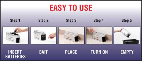 • Easy to use - insert batteries, bait, place, turn it on, and relax