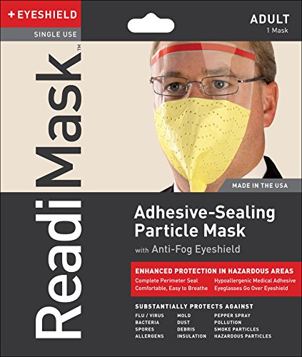 ReadiMaskTM Adhesive-Sealing Particle Mask with Anti-Fog Eyeshield • Adult Size • Offers Enhanced Protection in Hazardous Environments • Complete Perimeter Seal • Comfortable, Easy to Breathe • Hypoallergenic Medical Adhesive • Eyeglasses Go Over Eyeshield • Substantially Protects Against Flu / Virus, Bacteria, Spores, Allergens, Mold, Dust, Debris, Insulation, Pepper Spray, Pollution, Smoke Particles, and Hazardous Particles • Certified P2 in Australia & New Zealand • New and Improved Packaging Design with 5 Year Shelf Life • Made in the USA •