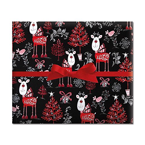 Reindeer on Black Rolled Gift Wrap Clever and cute, our well-dressed reindeer are so noticeable under the tree that they may tempt some to open their gifts early. Heavy, boutique-quality wrapping paper Giant roll is 23" x 38' — a whopping 72 square feet!