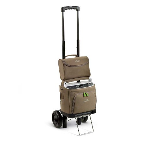 The Respironics SimplyGo Mobile Cart has six-inch wheels that provide maneuverability over challenging terrain. The handle slides up and down with different settings for personalized adjustment.