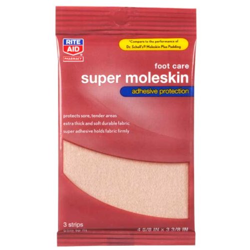 Adhesive Protection - Extra Soft Fabric 3 Strips 4-5/8" x 3-3/8" Protects sore tender areas Extra thick and soft durable fabric Super adhesive holds fabric firmly Trim-to-fit Soft durable fabric protects sensitive areas Self-stick waterproof adhesive holds Super Moleskin firmly in place Hypo-allergenic Will not snag hosiery Trim-to-fit Rite Aid Satisfaction GuaranteeÊ- If you're not satisfied, we'll happily refund your money. (See manufacturer for details). *Compared to Dr. Scholl's¨ Made in USA