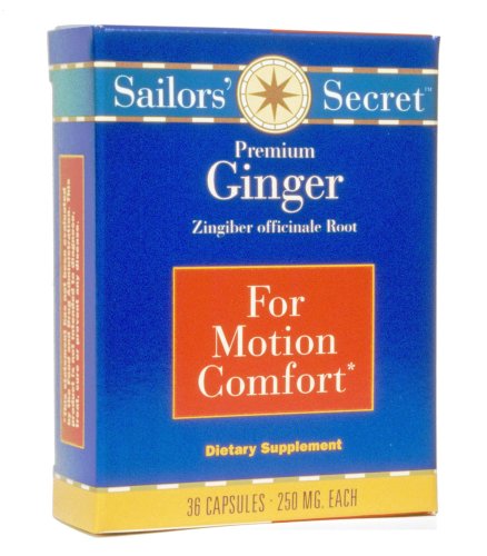 Relieve the symptoms of motion sickness (upset stomach, nausea, vomiting, headache, dizziness, paleness, fatigue) with Sailor's Secret Premium Ginger capsules. Each convenient travel-sized box contains 36 capsules, safety sealed on 3 waterproof blister cards. Each capsule contains 250 mg. of premium powdered Ginger root.
