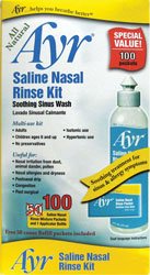 Saline Nasal Rinse Kit from Ayr is an all-in-one, all-natural nasal wash system. This multi-use kit provides soothing comfort both for adults and children 6 and up and allows for both isotonic and hypertonic use. There are 100 single-use saline nasal rinse mixture packets included, as well as one easy to use, reusable applicator bottle. Features include: convenient re-closeable cap, preservative and iodine free, top-rack dishwasher safe, no burning or stinging, buffered to neutral pH and it's easy to use.