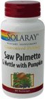 Saw Palmetto w Nettle Pumpkin by Solaray 90 Softgel Saw Palmetto w Nettle Pumpkin Size 90ct 780mg Softgel Directions As a dietary supplement take three perlecaps daily with meals or a glass of water. Serving Size 3 Softgel 30 Servings per container Ingredients Amount per serving Daily Value + Calories 15 Saw Palmetto (Serenoa repens) (berry oil) (Guaranteed 272 mg 85 fatty acids and sterols minimum) 320 mg Pumpkin (Cucurbita pepo) (seed oil) 400 mg Nettle (Urtica dioica) (root extract) (Guaranteed 4.8 mg 0.8 beta-sitosterol) 600 mg Total Fat 1 g 1 Key to Ingredients Daily Value not established. + Percent Daily Value is based on a 2 000 calorie diet. Values differ depending on age Values differ depending on age Other Ingredients Gelatin Perlecap Glycerin Vegetable Oil Water Lecithin Beeswax Other See product label for more information.