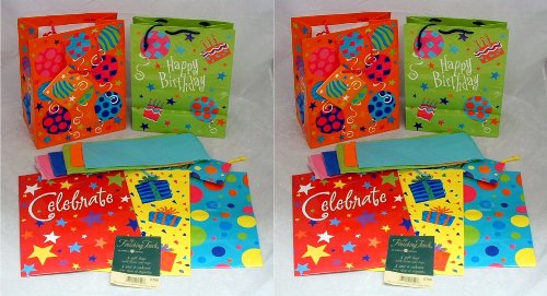 Set of 10 laminated all occasion gift bags with tissue, rope handles & tags. Each bag measures 9.75" x 7.75" x 4.5". The 5 sheets of color tissue measures 19.5" x 19.5". From American Greetings for birthdays or any celebration.