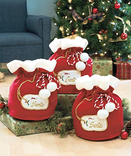 Jumbo gift bags are styled to look like Santa's sack! Sold as a set of 3, each fabric bag is big enough to hold a doll, a stuffed animal, games, puzzles and more. Comes with an appliqu d tag announcing that it's from Santa himself. The drawstring closure has fuzzy pom-poms for extra whimsy. Bags are reusable, so you can present special gifts in them year after year! Approx. 12" x 8-1/2" dia., each. Polyester.