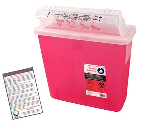 - This kit contains top selling sharps disposal container made by Dynarex item # 4624 plus a guide with the FDA recommended process for properly disposing of used needles and other sharps printed on a 4''x6'' card by Vakly.
