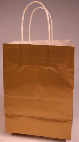 Wholesale pack of 12 elegant paper shopping-type handle bags in a shiny gold color. Great for gift giving, retail and craft use. These attractive bags feature a nice quality of paper and strong twine handles. Provides the perfect base to accent and decorate. The uses are endless. Each bag measures 10 inches tall by 8 inches wide x 4.25 inches thick. Imported.