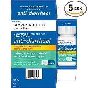 - Simply RightTM Anti-Diarrheal Caplets 2 - 200 ct. bottles Twin pack Laboratory tested, quality assured Compare to Imodium® A-D active ingredient* 3.598"H x 3.558"W x 1.887"D