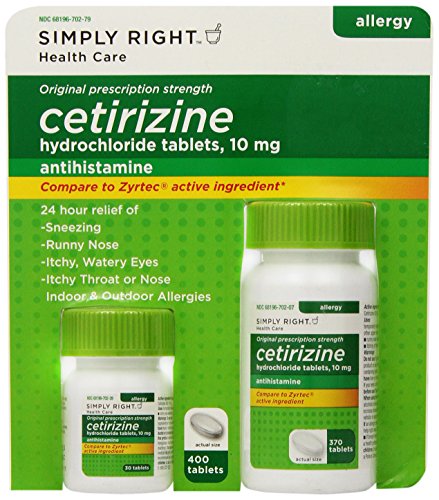 Simply Right Cetirizine Hydrochloride Antihistamine temporarily relieves these symptoms due to hay fever or other upper respiratory allergies: runny nose, sneezing, itching of the nose or throat and itchy, watery eyes.