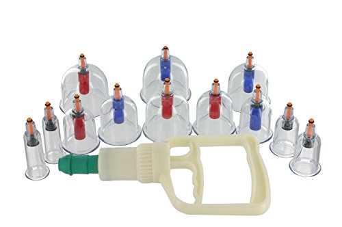 This 12-Piece Deluxe Cupping Set is a unique way to relieve sore and aching muscles. The cupping method stems from traditional Chinese medicine, but its effects can be enjoyed in a variety of ways. Simply place one or more cups directly onto the skin, attach the tubing to the top opening of the cup and to the hand-held pump, and then pull the pump trigger to create suction. The tubing may be detached and the cups will still remain attaching on the skin by the vacuum. Acu-Points centered within the cups provide addtional stimulation against the skin. Measurements: Set includes two cups of each of the following inside diameters: 0.625, 1, 1.25, 1.625, 2, and 2.25 inches. Material: Cups are ABS plastic. Color: Cups are clear. Note: Read instructions before use.