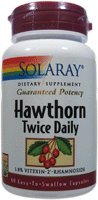 Hawthorn Two Daily 300mg by Solaray 60 Capsule Size 60ct 300mg Directions As a dietary supplement take two capsules daily with meals or a glass of water. Serving Size 2 Capsule 30 Servings per container Ingredients Amount per serving Daily Value + Hawthorn (Crataegus oxyacantha) (berry) 400 mg Hawthorn (Crataegus oxyacantha) (top branches with flowers extract) (Guaranteed 10.8 mg 1.8 vitexin-2-rhamnoside) 600 mg Dietary Fiber 1 g 3 Total Carbohydrate 1 g 1 Key to Ingredients Daily Value not established. + Percent Daily Value is based on a 2 000 calorie diet. Values differ depending on age Values differ depending on age Other Ingredients Maltodextrin Gelatin (capsule) Cellulose Magnesium Stearate and Silica Other See product label for more information.