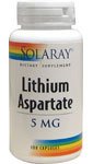 Lithium Aspartate 5mg by Solaray 100 Capsule Lithium is an important trace element naturally occurring in many types of foods including grains and vegetables. Size 100ct 5mg Directions As a dietary supplement take 1 capsule daily. Serving Size 1 Capsule 100 Servings per container Ingredients Amount per serving Daily Value + Lithium (as Lithium Aspartate) 5 mg Key to Ingredients Daily Value not established. + Percent Daily Value is based on a 2 000 calorie diet. Values differ depending on age Values differ depending on age Other Ingredients Cellulose Gelatin Capsule and Magnesium Stearate Other See product label for more information.