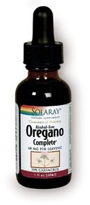 Oregano Complete by Solaray 1 oz Liquid 100 vegetarian. Wild Harvested. As a natural product aroma and taste may vary. Directions As a dietary supplement use 3 drops of oil diluted in 1-4 ounces of juice water or apply topically as needed. Due to the strength of product heat sensation may occur. Serving Size 3 Liquid Ingredients Amount per serving Daily Value + Proprietary Blend Extra Virgin Cold Pressed Olive Oil (Olea europaea) and Mediterranean Wild Oregano (Origanum vulgare) (leaf oil) (Guaranteed to contain 14 mg 70 Carvacrol) 68 mg Key to Ingredients Daily Value not established. + Percent Daily Value is based on a 2 000 calorie diet. Values differ depending on age Values differ depending on age