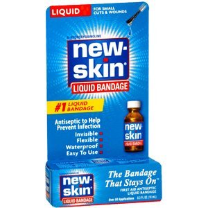 8-Hydroxyquinoline. Liquid. Over 50 applications. No. 1 liquid bandage. Antiseptic to help prevent infections. Invisible. Flexible. Waterproof. Easy to use. Use New-Skin for: paper cuts, chapped and cracked fingertips, shavings nicks, hangnails, help in p