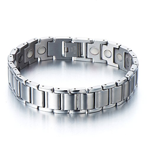 Fashioned of polished and satin stainless steel, this exceptionally designed piece features sturdy stainless steel links stainless steel links embedded with 3000g magnets. Stylish shin and matt combination makes it a great go-to look for him. This 0.53 inches wide bracelet measures 8.5 inches in length. The easy-to-wear fold-over clasp completes the look with a secure and comfortable fit. Crafted of the finest pure-grade surgical steel for durability, value and beauty, this contemporary jewelry collection exudes elegant workmanship through every facet.